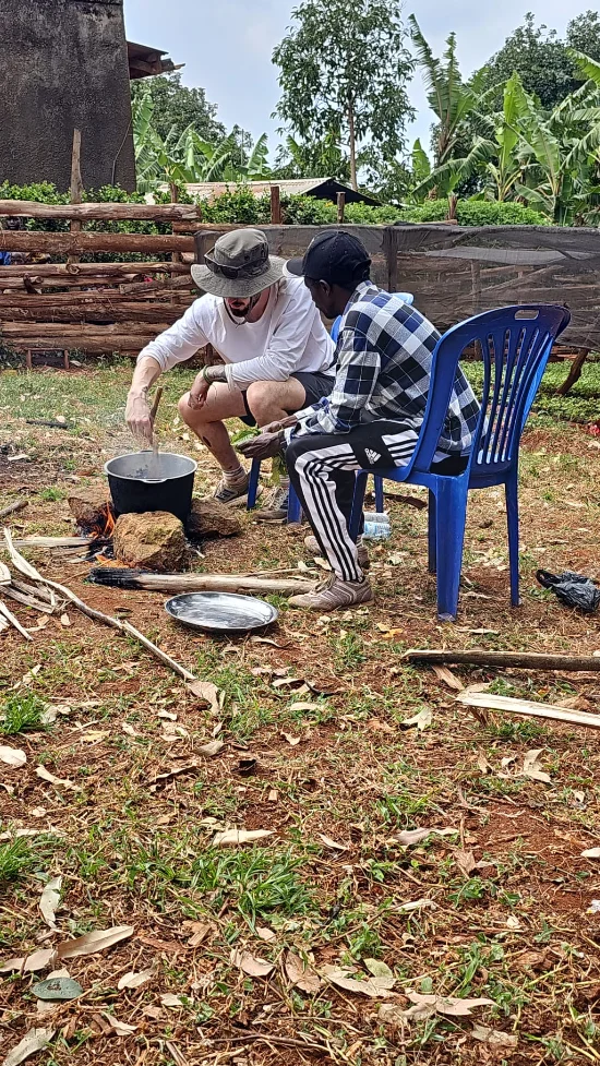 During our time in Sipi, Ken took us to a local coffee tree nursery to come and share a fresh brew together. After reaching there having traipsed up to 2000m total elevation past multiple gorgeous waterfalls, we were told we needed to roast, grind and brew the coffee!! So, we began. Ken started a fire for us, gave us a well used pot, some wonderfully fresh green beans from the local farmers and a wooden spoon. Joshua, sat by the fire, spoon in hand, awaited his first roast since training on a fancy 100g roaster named Rory back at EA HQ. Talk about prepared…
