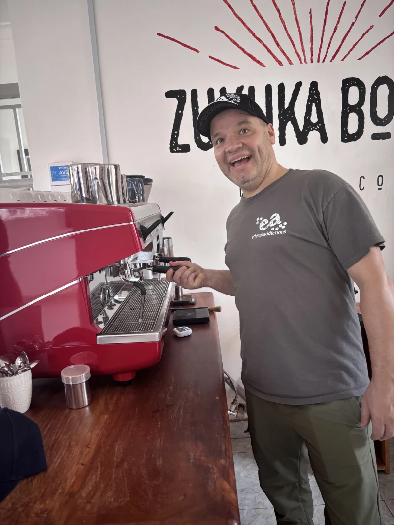 “It was a surreal and humbling experience spending the afternoon with Ken and Kenneth. Being brought into the middle of coffee country and seeing how basic everything was, was quite astonishing. I think because coffee is this massive global commodity I had always thought it would be a huge corporate machine that churned out tonnes of coffee to supply the insane demand we require in the West, and although this can be true, here, it is another story. Seeing the poverty that surrounded the coffee farms, and how incredibly meticulous Kenneth was about every aspect of his coffee trees, it gave me a true appreciation of how much time and care is put into growing exceptional coffee. To be standing on Mt. Elgon, surrounded by trees and waterfalls, and being a part of a conversation between Ian and Kenneth, talking about coffee, each inspiring the other with their knowledge and stories was a once in a life-time experience. Ian has built Ethical Addictions around “Farm Direct Coffee” and to see how much effort this actually requires has made me respect what he has built so much more.”